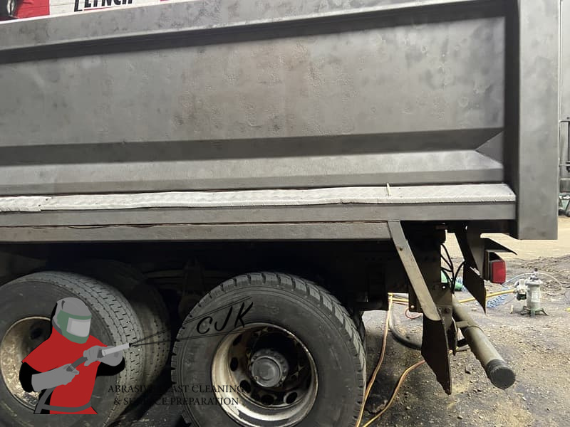 This truck body was blasted at high pressure to remove old paint and flaking rust. The blasting also removed all the old labels and stickers, including the glue. Leaving a nice clean key for re-painting the vehicle in the company’s fleet colours.